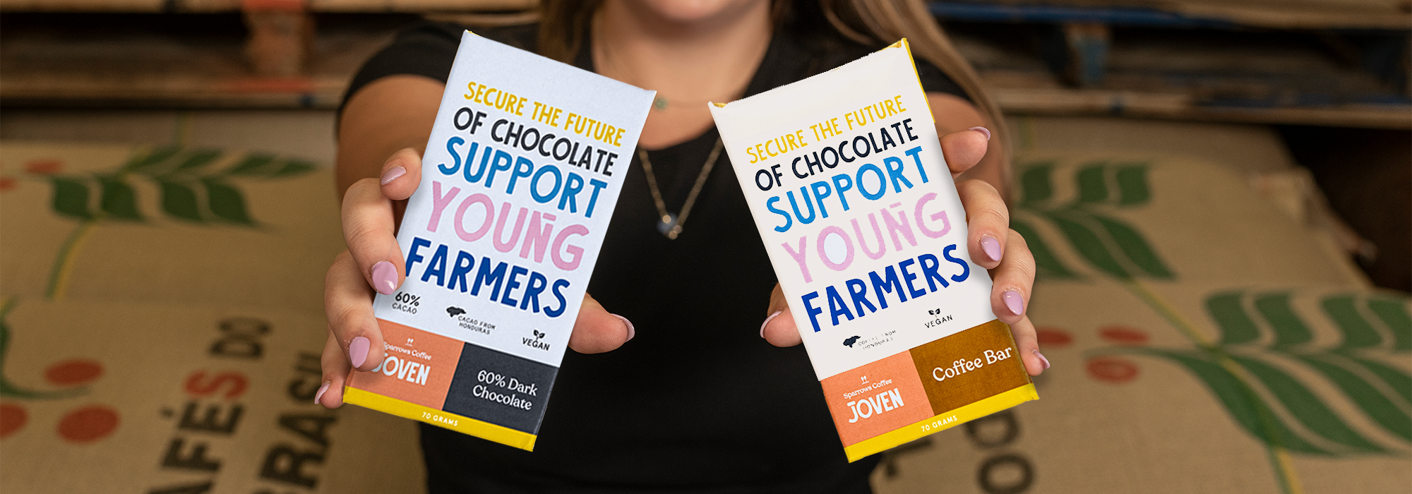Expanding its mission to work with young farmers across the globe, Joven Coffee (led by the world’s youngest Q grader Frankie Volkema), has started to work with young cacao farmers too. Working with our partner Atucun Chocolateria in Honduras, we’re launching a first-of-its-kind bar made from just coffee beans, extracted cocoa butter, and organic cane sugar. It’s sooooo good!! We are also introducing the coffee used in that bar from Honduran farmer Abraham Pacheco. He’s 23 years old and already producing some seriously good beans—we’re grateful to be working together.